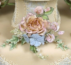 Cake Top: “Fountain”Lambeth method pillows with sugar flowers. |