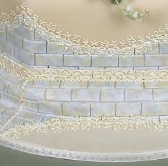 Details: Sugar flowers,and a cast sugar separator covered with fondant, sugar tiles, and piping. |